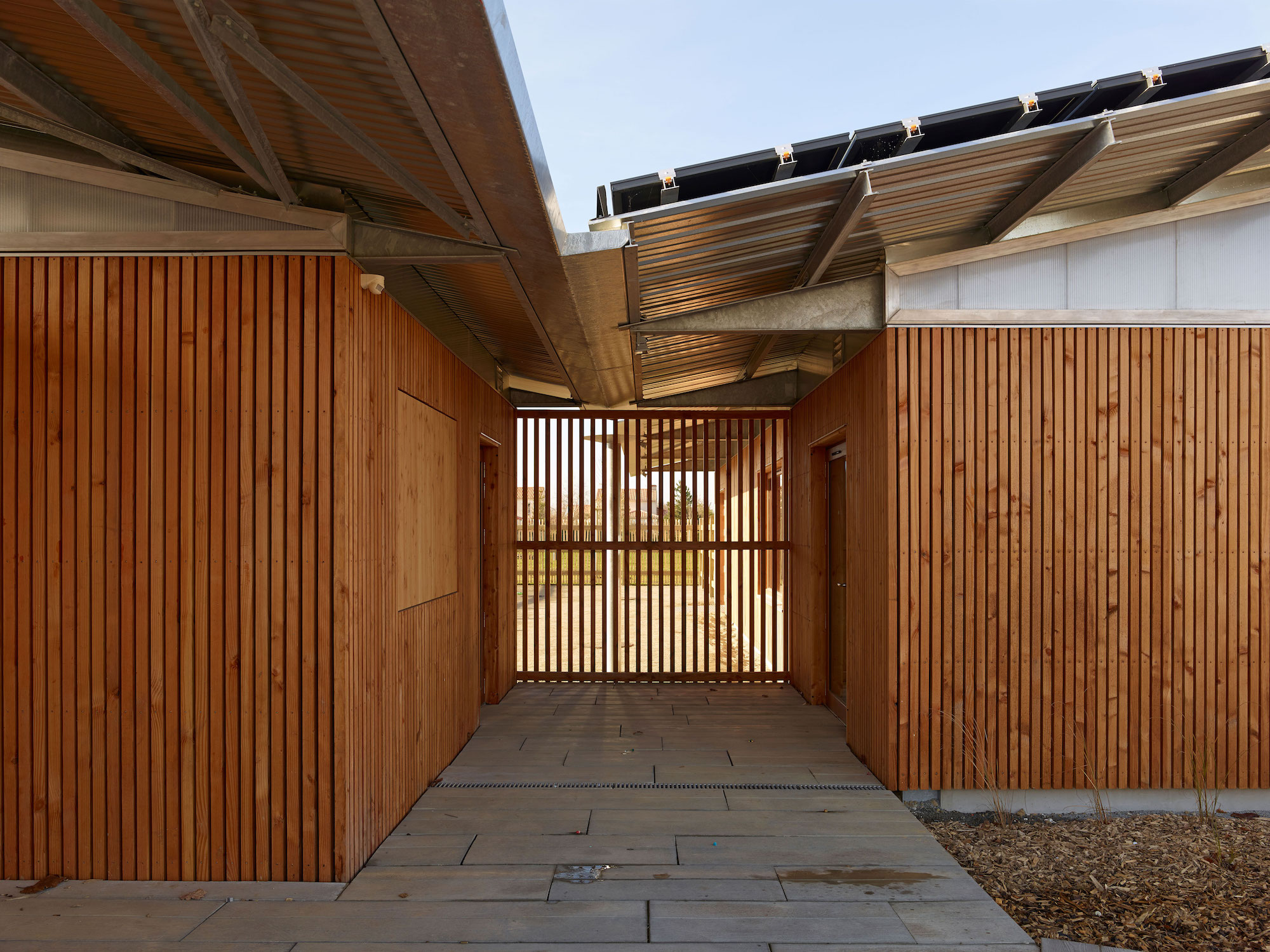 Performances écologiques et matières. Structure métallique et ossature bois — Isolation en double couche par l’extérieur — Bardage bois douglas: pose verticale à claire-voie — Polycarbonate alvéolaire Polyrey Ice — Panneaux photovoltaïques (196 m2 plein Sud) — Couvertures bac acier — Dispositif de récupération des eaux pluviales et de rétention / Menuiseries extérieures bois